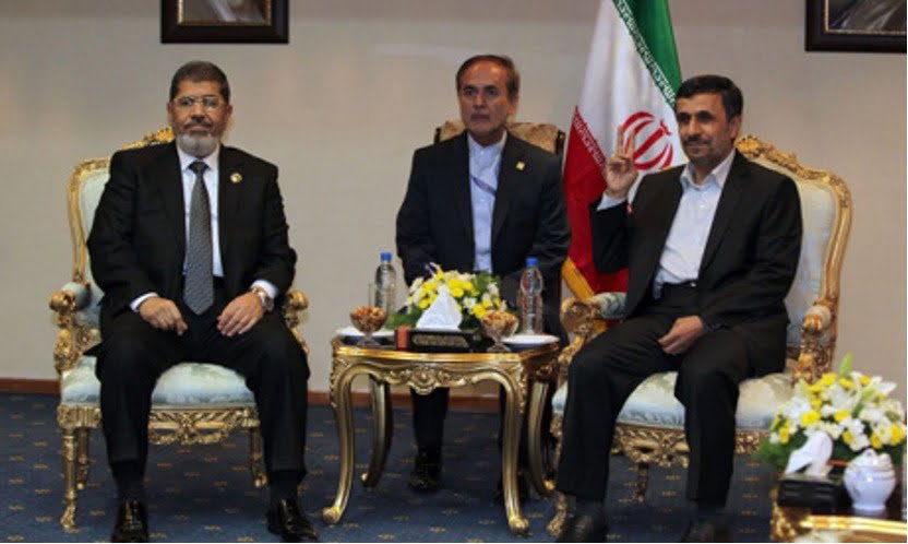 2012年,穆罕默德.穆希(Mohamed Morsi,圖左)訪問伊朗並與伊朗總統馬哈茂德.阿赫瑪迪內賈德(Mahmoud Ahmadinejad,圖右)會面。(照片來源:AP)
