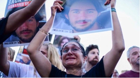 人質的家屬在抗特哈維夫舉起被擄家人的照片。(照片來源:Tomer Neuberg/Flash90)