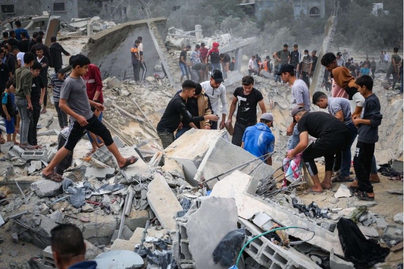 巴勒斯坦人在加薩走廊的汗尤尼斯(Khan Yunis)檢查以色列空襲後被摧毀的建築廢墟。(照片來源:Atia Mohammed/Flash90)