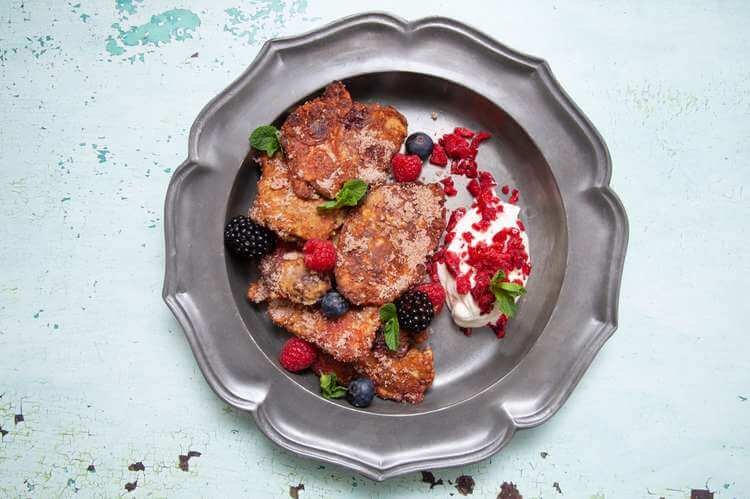 無酵蛋奶煎餅有很多種做法,而這款經典食譜的升級版,以奶油、牛奶和香草打底,再豪邁地加入新鮮或冷凍的覆盆子,絕對是逾越節慶早午餐的奢華選擇。