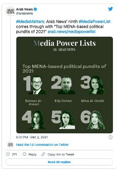 今日以色列報的阿拉伯事務記者埃迪.科恩(Edy Cohen)被譽為最具有影響力的阿拉伯語評論員之一。