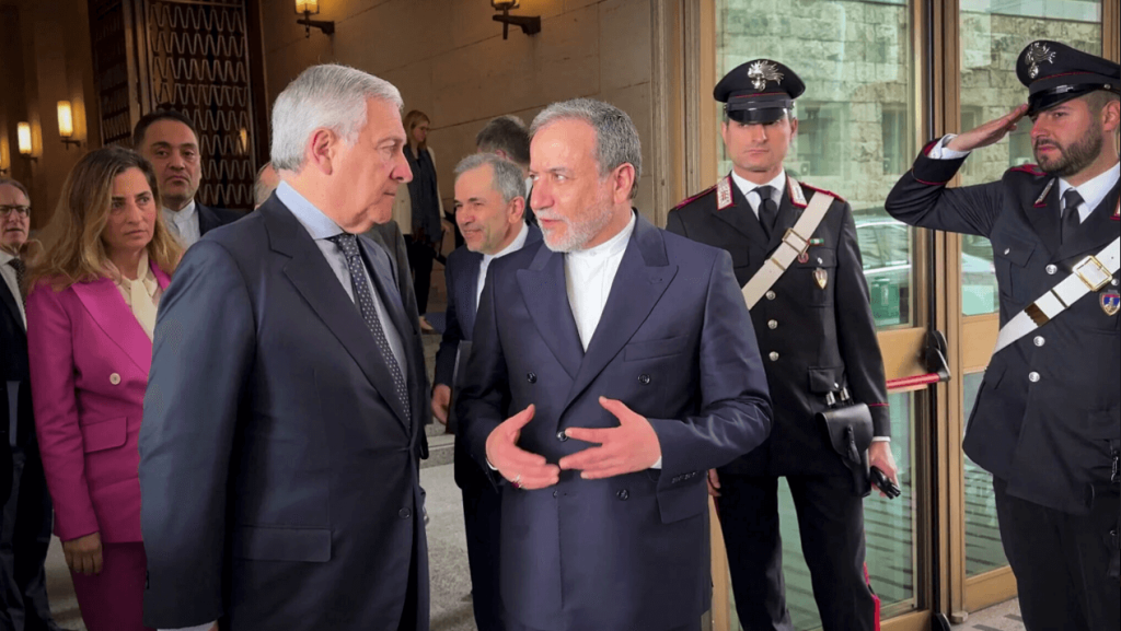 2025年4月19日,在美伊第二輪核談判前,義大利外交部長安東尼奧.塔亞尼(Antonio Tajani,左)與伊朗外交部長阿巴斯.阿拉格齊(Abbas Araghchi,右)會面一景。(照片來源:TALIAN FOREIGN MINISTRY/AFP)