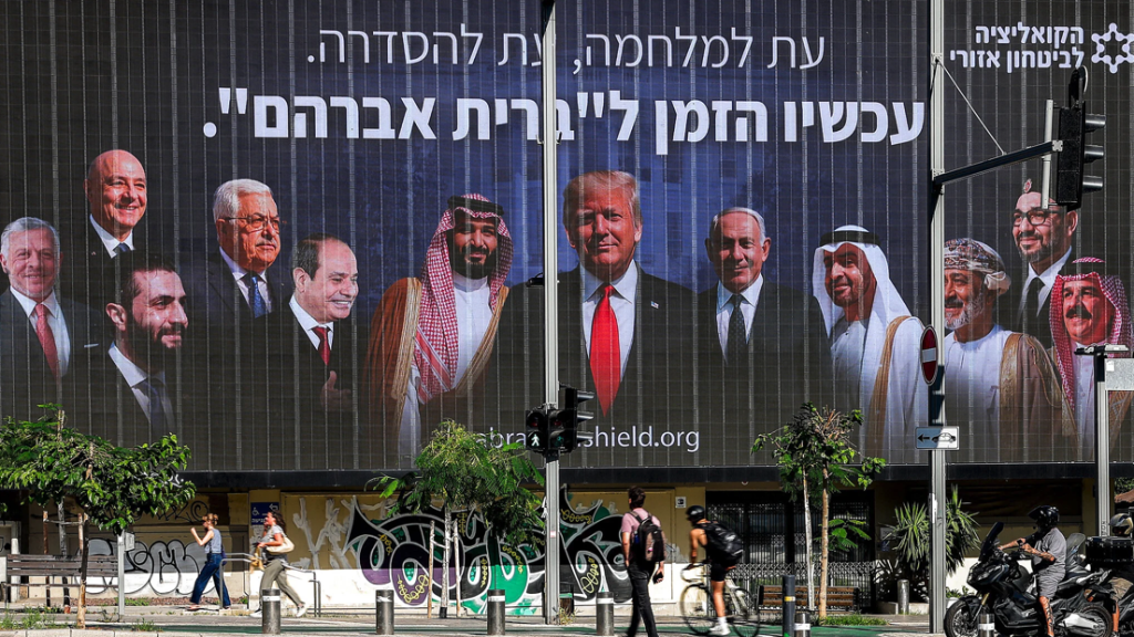 2025年6月26日,位於特拉維夫的一塊廣告牌上,描繪著美國總統川普、以色列總理納坦雅胡與中東領袖等人的圖像,並寫上希伯來語,以呼籲「簽訂新的亞伯拉罕協議」。(照片來源:Jack Guez/AFP)