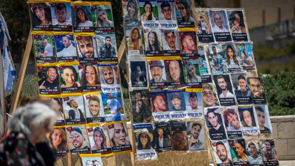 2025年7月6日,位於耶路撒冷總理辦公室附近的看板,上頭是被挾持的人質以及近期罹難的以色列士兵的照片。(照片來源:YONATAN SINDEL/FLASH90)