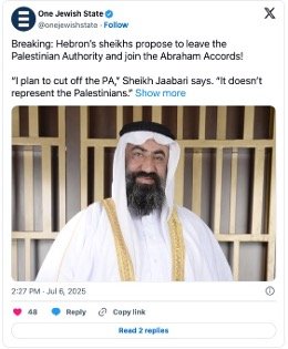 貼文:希伯崙酋長提議脫離巴勒斯坦自治政府,加入「亞伯拉罕協議」!「我計劃與巴勒斯坦自治政府斷絕關係。」酋長賈巴里說道:「它不代表巴勒斯坦人。」