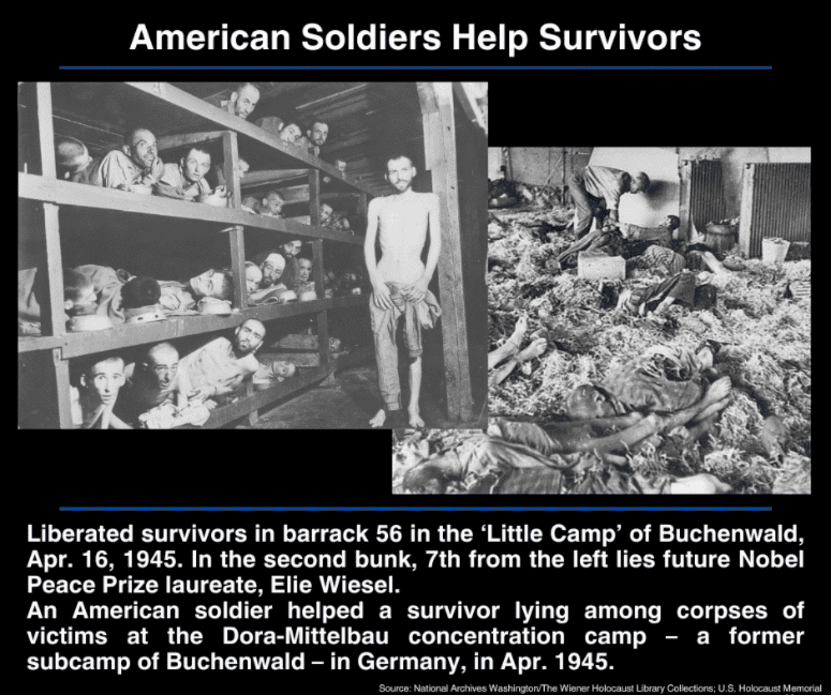巴頓將軍(George S. Patton)的部隊進入布亨瓦德(Buchenwald),第45步兵師進駐達豪(Dachau),第七軍則是進駐蘭茨貝格(Landsberg)。他們面對的不是敵軍士兵,而是在種族滅絕意識形態之下的犧牲者:骨瘦如柴的倖存者、堆積如山的屍骸,還有撲鼻而來的死亡腐臭氣味。這已非是預期中的殘酷戰鬥,而是在對猶太人和其他目標群體的強烈仇恨推動下,所精心策劃的滅絕系統。
