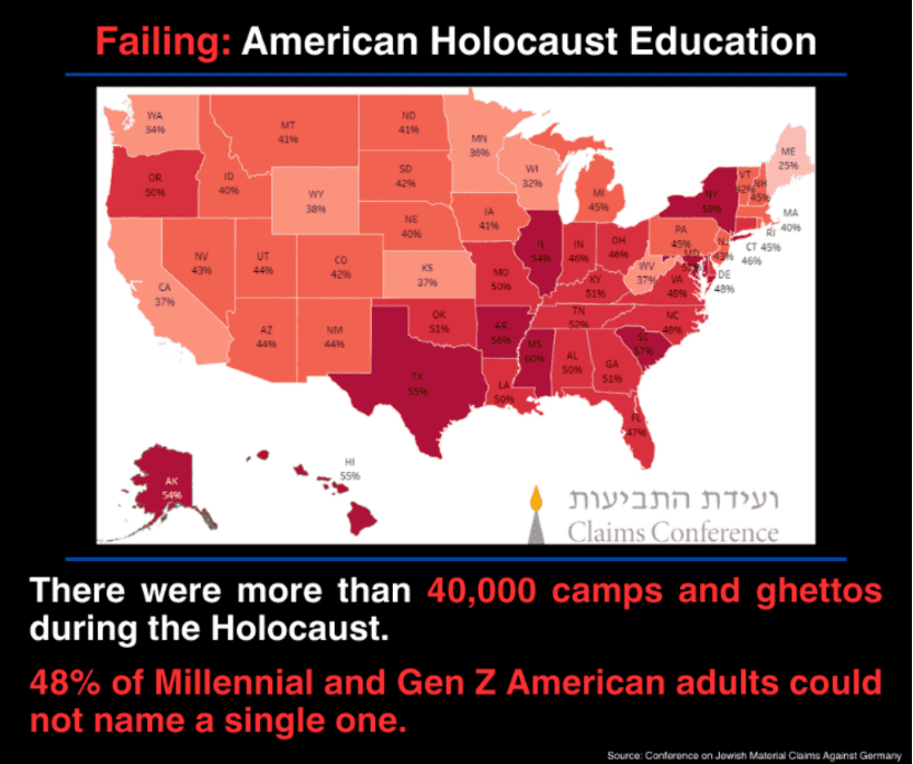 然而,近年來對大屠殺知識的調查顯示,在美國和世界各地,特別是在Z世代和千禧世代中,無知的程度令人震驚。許多人竟無法說出任何一個集中營的名字,不知道奧斯威辛(Auschwitz),甚至不知道有600萬猶太人在大屠殺中被殺害,或以為人數不到200萬。更令人髮指的是,竟有人認為是猶太人自己導致了大屠殺。