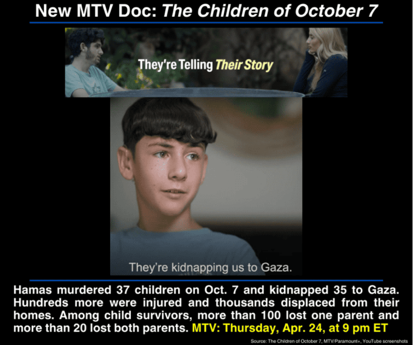 美國歌手、舞蹈家、社群網紅與行動主義者蒙塔娜.塔克(Montana Tucker),她的祖父母是奧斯威辛倖存者。她親自採訪以色列的兒童,拍攝成一部名為《10月7日的孩子們》(The Children of October 7)的紀錄片,MTV於4月24日「猶太大屠殺紀念日」(Yom Hashoah)美東時間晚間9點,無廣告的播出了36分鐘的紀錄片。