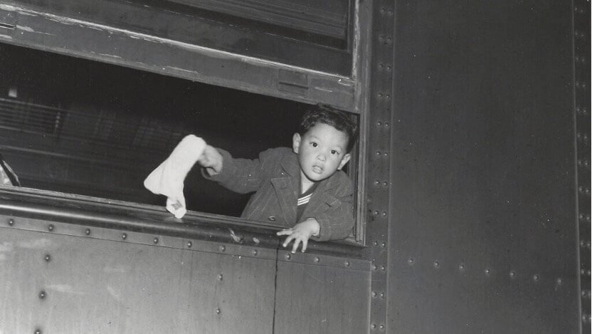 湯米.米田(Tommy Yoneda)在開往曼薩納爾的火車上揮手告別。(照片由加州大學洛杉磯分校圖書館特藏部門Karl G. Yoneda 論文提供)
