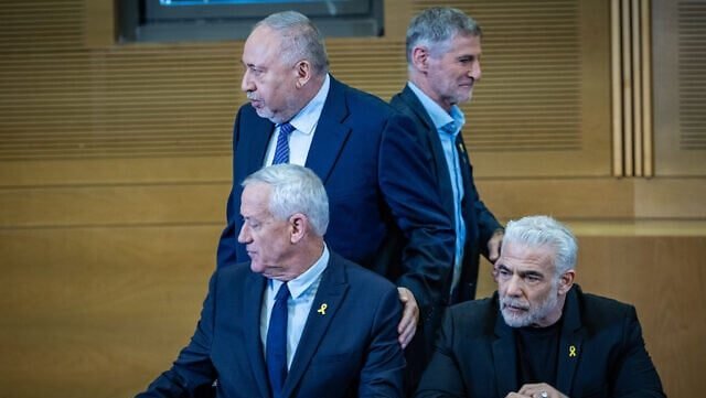 以色列議會中反對黨的領袖:「以色列是我們的家園黨」(Yisrael Beytenu)黨魁阿維格多.李柏曼(Avigdor Liberman)、「民主黨」(The Democrats)黨魁亞伊爾.高蘭(Yair Golan)、「藍白黨」(Blue and White)黨魁(Benny Gantz)本尼.甘茨與「未來黨」(Yesh Atid)黨魁亞伊爾.拉皮德(Yair Lapid)。(照片來源:Yonatan Sindel/Flash90)