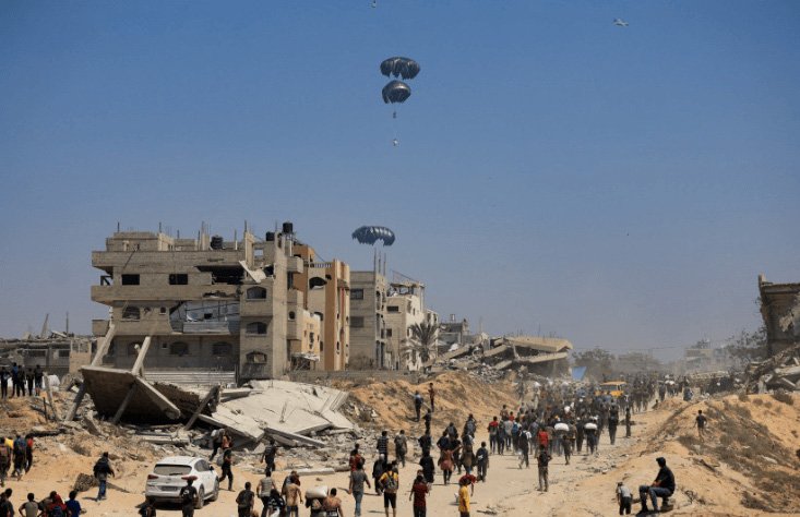 2025年7月27日,加薩北部拍攝到的畫面,人道救援物資正被空投至加薩地區。(照片來源:REUTERS/DAWOUD ABU ALKAS)
