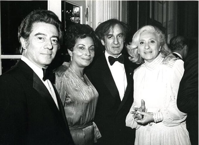 由左至右:西吉與娜歐蜜.威爾齊格(Naomi Wilzig)、諾貝爾獎得主艾利.維瑟爾(Elie Wiesel)及其妻子瑪莉恩(Marion)。1978年,西吉與艾利同時獲美國總統卡特任命,擔任「美國總統大屠殺委員會」(President’s Commission on the Holocaust)成員。