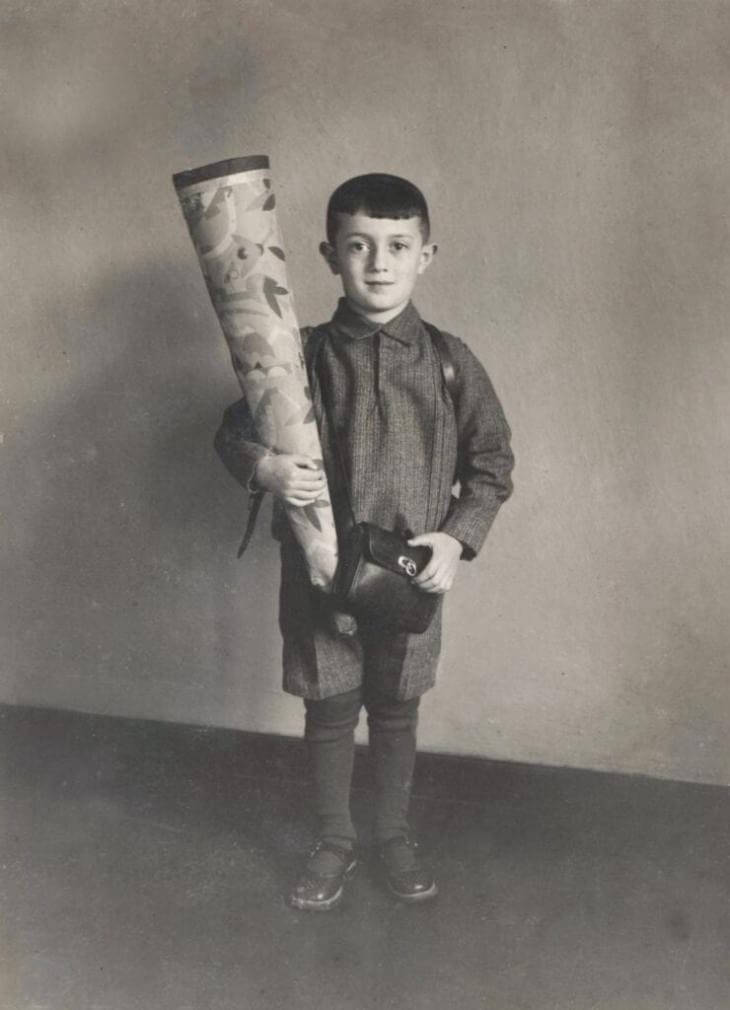 1932年:六歲的西吉手拿一個他的父母給他預備的裝滿糖果的紙筒,這是在德國傳統中父母會慶祝孩子第一天入學所給的禮物。