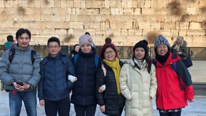 周理事長&雲嵐牧師也跟我們一起在餐桌吃飯,談笑中,很快我們彼此打開心,聽著雲嵐牧師很甜蜜的跟我們說,她和理事長的結婚見證及理事長是如何孝順媽媽。我們也一起敬拜禱告,當我們圍坐聽著周理事長說,在亡國2000多年,以色列復國,我們所看見的每一個猶太人都是神蹟,當六日戰爭,2000多年來,猶太人第一次回到耶路撒冷舊城,找不到信仰的根源西牆(第一二聖殿所在),卻是由一個阿拉伯人帶著猶太人來到西牆,周理事長哽咽,我們也飇淚;當雲嵐牧師分享,亞伯拉罕、以撒、雅各的信心,猶太根源的產業,也是我們這些插枝的野橄欖的產業,我們要跟神求如何與猶太長兄連結,也跟神求一句經文、啟示及異象…這一切一切都讓我們更深具體化此行連結猶太根源的意義,也讓我們彼此間又像師徒又像朋友又像家人!