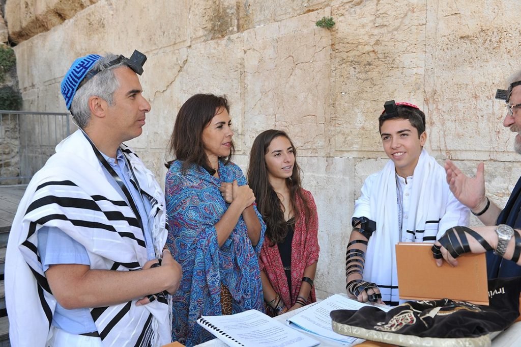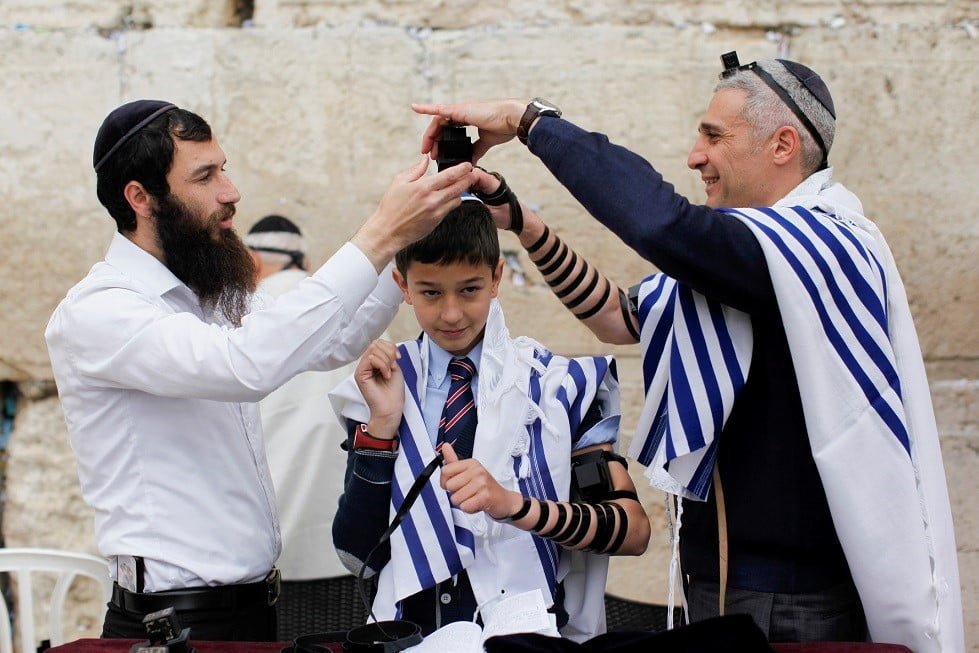 在猶太成年禮中,家長親自為孩子戴上護經匣(tephillin)。(照片:Yonatan Sindel/Ministerio de Turismo de Israel)