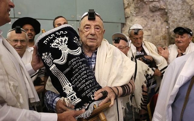 2016年5月2日,在耶路撒冷老城的西牆,數十名大屠殺倖存者披著祈禱披巾完成他們的成年禮。(照片:Menahem Kahana/法新社)